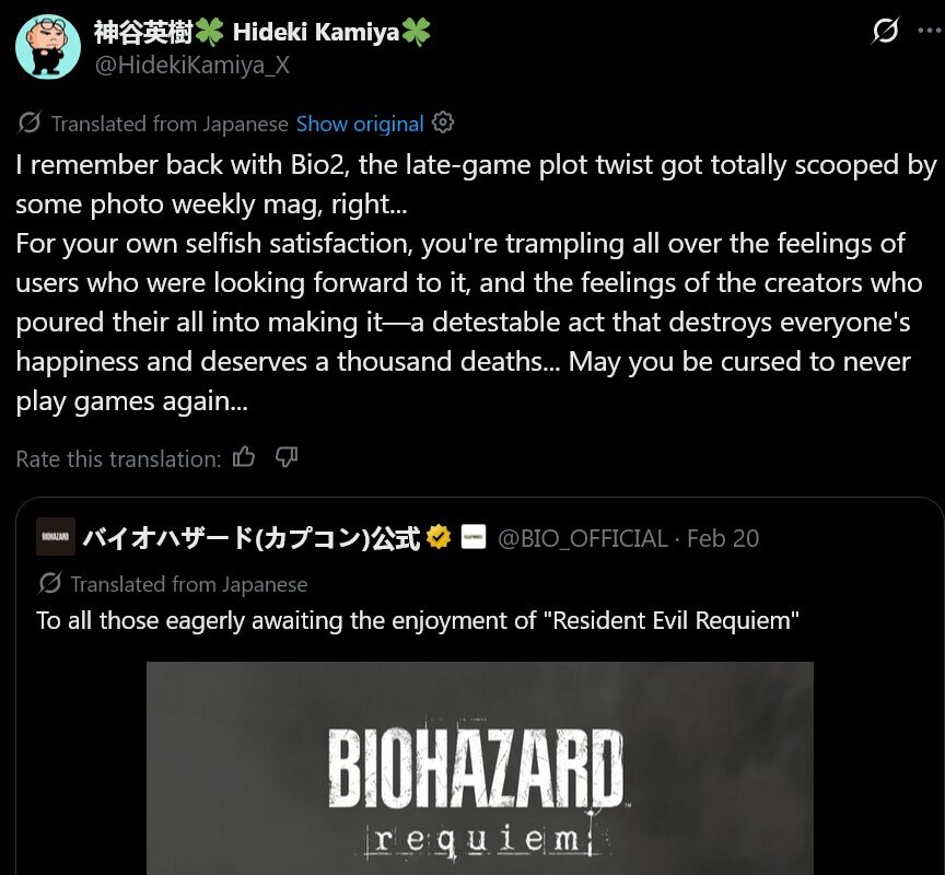 Resident Evil Requiem sızıntılarına RE2 yönetmeni Hideki Kamiya’dan güçlü tepki. Spoiler yayanlara yönelik sert açıklamalar ve Capcom’un yasal mücadelesi.