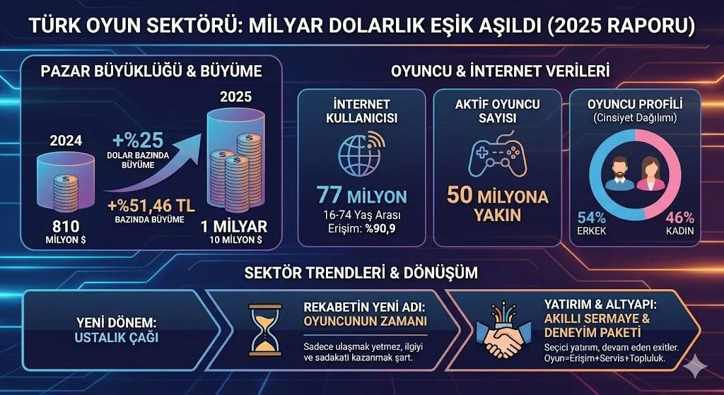 Türkiye oyun pazarı 2025’te 1 milyar doları aştı. %24,69’luk büyümeyle 50 milyon oyuncuya ulaşan sektör, yeni dönemine girdi. Detaylı rapor analizi.