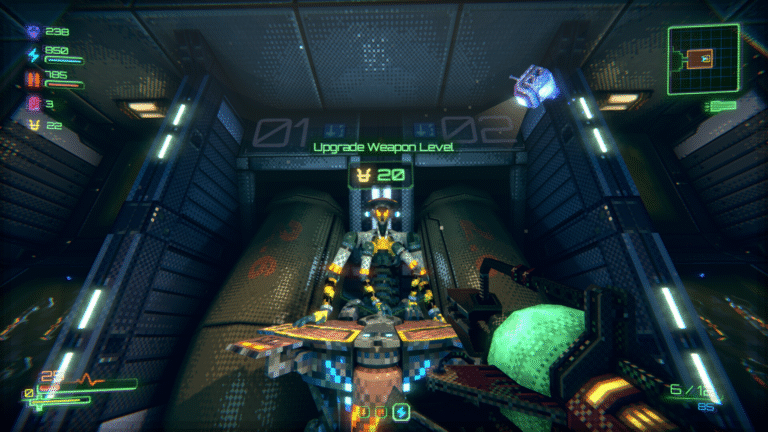 Moros Protocol’ün görsel tarzı, klasik voxel estetiğini modern ışıklandırma teknikleriyle birleştiriyor. Düşün: Minecraft’ın bloklu dünyasını değil, Quake 2 RTX’in ışık oyunlarını andıran, parlak metalik yüzeylerin ve titreşen neon ışıkların hâkim olduğu bir bilim kurgu kabusu. Her alan, el yapımı gibi hissettiriyor.