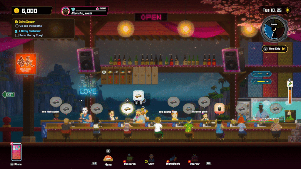 Xbox’ta bu bölüm, özellikle hızlı buton kullanımı gerektirdiği için kontrolcü desteği çok doğal hissettiriyor. Sipariş almak, wasabi tamamlamak, içecek servis etmek, müşterileri mutlu etmek… Her biri kısa süreli ama yoğun mini görevler gibi. Restoran ne kadar popüler olursa, müşteri trafiği o kadar artıyor; masalar doluyor, siparişler hızlanıyor ve siz de ister istemez oyunun ritmine kendinizi kaptırıyorsunuz.